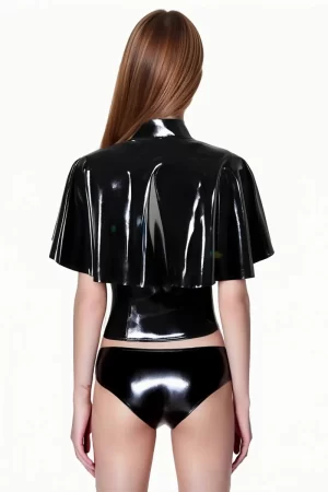 This Retro inspired sleeveless top is a great way to wear latex outside in the rain! Features a metal zip front with belt, princess seams and collar with snap closure. The attached cape cover arms and is slightly longer at back.